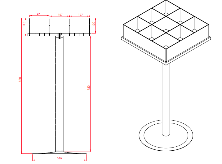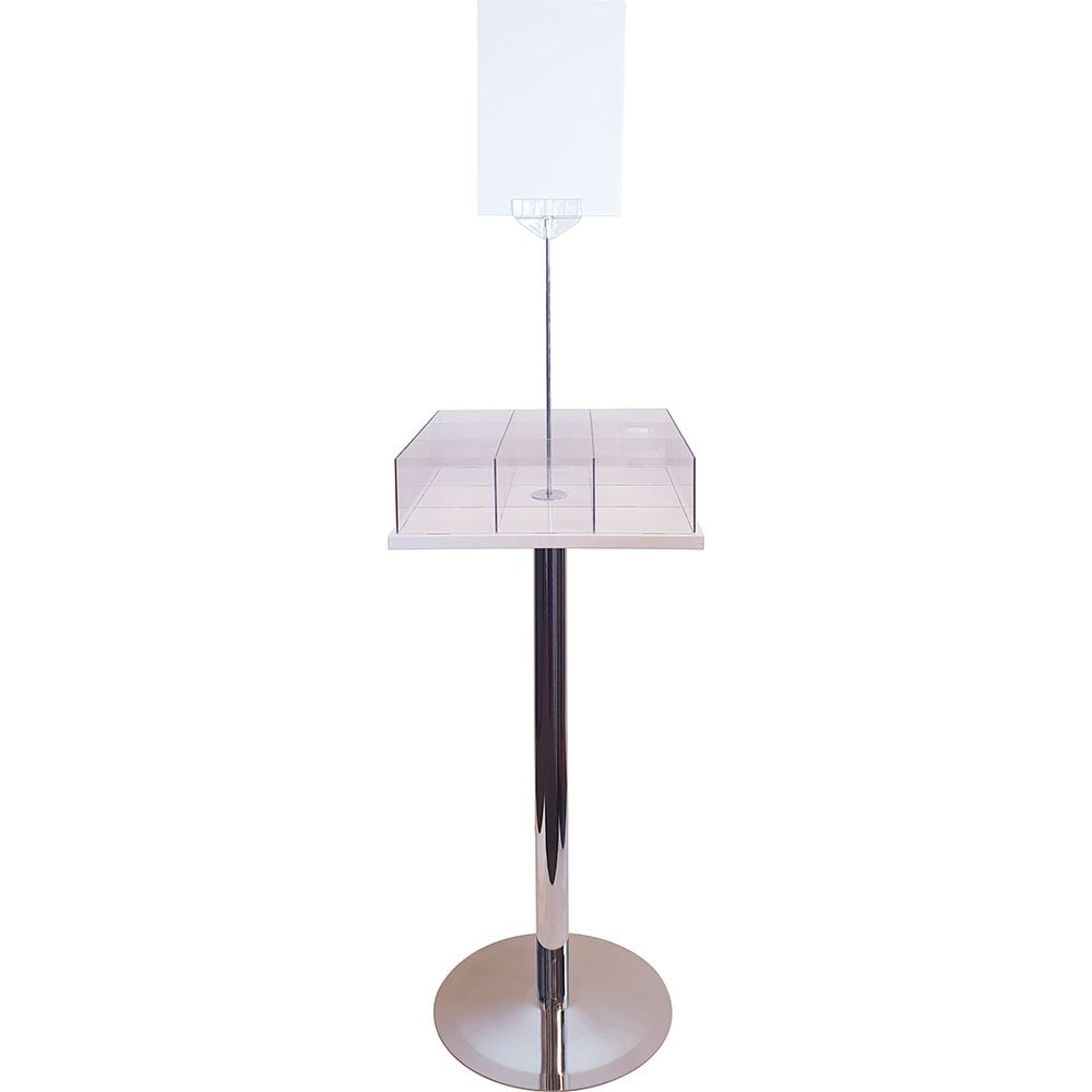 Ayaklı Kozmetik standı 9 adet, 12.5 cm'lik gözden oluşmaktadır. Her bir göz pleksi kenarlık ile sabitlenmiştir. Kolaylıkla kurulabilir ve demonte olarak sevk edilir.