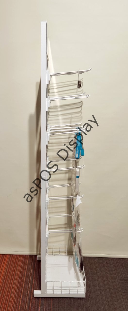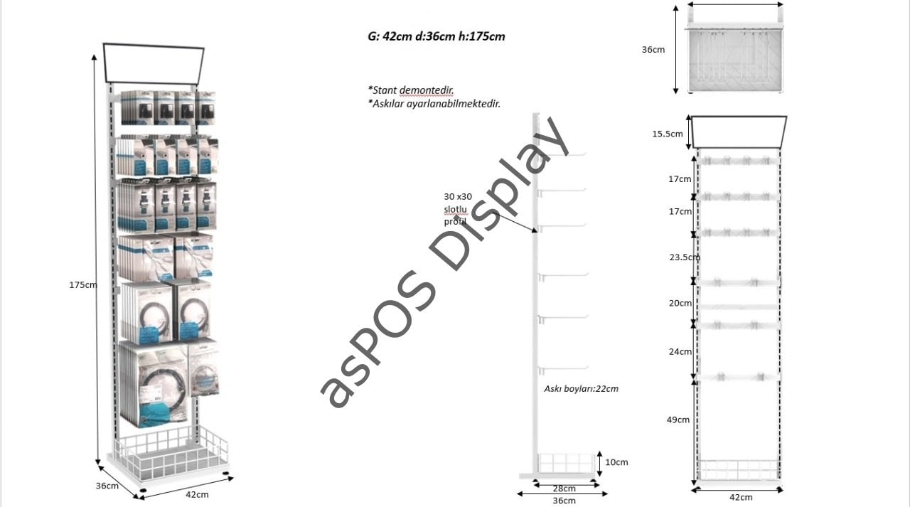 Paketli ve askılı ürünleri toplu olarak sergilemek için tasarlanan stand, metal gövdesiyle bir çok ürünü sergilemenize olanak sağlayacaktır. Stand 6 raf ve raf başına 4 adet askıdan oluşmaktadır.