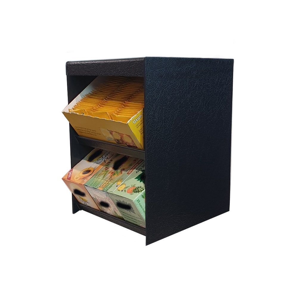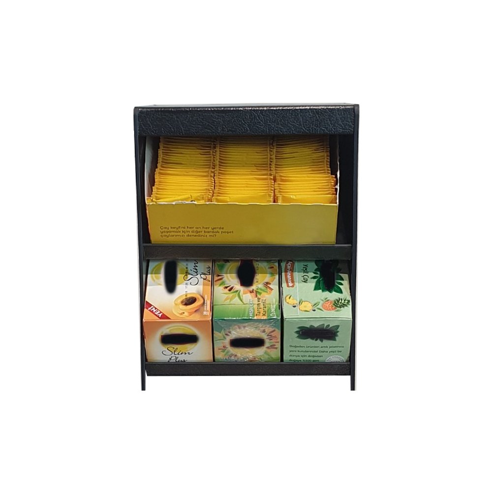 Büyük ve küçük poşet çay kutularını konumlandırabileceğiniz stand, şık deri desenli malzemeden, 2 raflı olarak tasarlanmıştır.