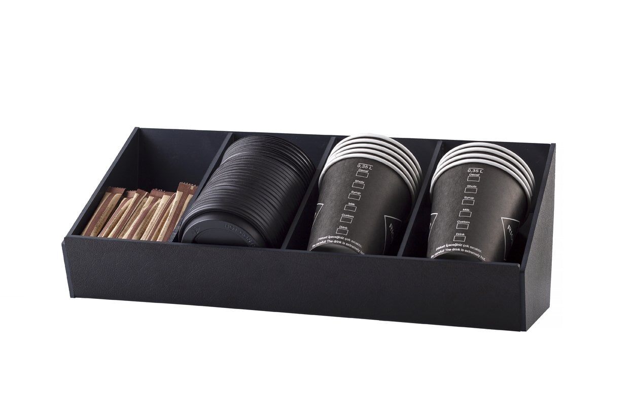 Yeni jenerasyon kahve dükkanlarının ihtiyaçları doğrultusunda tasarlanan Tezgahönü/Bar Önü/Kasa Önü Aperatif Standı 4 hazneli yapısıyla Çikolata, Bisküvi, Şeker, Peçete, Karton Bardak Kapağı ve diğer içeriklerinizi konumlandırmanıza olanak sağlayacaktır.